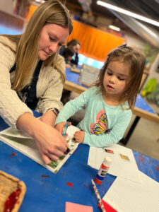 This week’s Mark Making activity invited guests to make a grocery list. For our younger guests, this may look like searching for fruits and veggies images from a grocery store ad or magazine, cutting them out, and gluing them down. Children may draw pictures of the food that they want or ask for help in spelling a word. With our programs being child-led, this allows the opportunity for children of all ages to come in with what knowledge they have and expand on those ideas and play schemas!