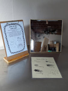 Play around with different types of mark making and drawing materials to create textures. Try out blind contour drawing – this is a drawing technique where you draw yourself (looking in a mirror) or another person, but you don’t look at your paper! Hint: Don’t pick up your pencil. When you’re done with your portraits, take it home or feel free to hang it up on the wall!