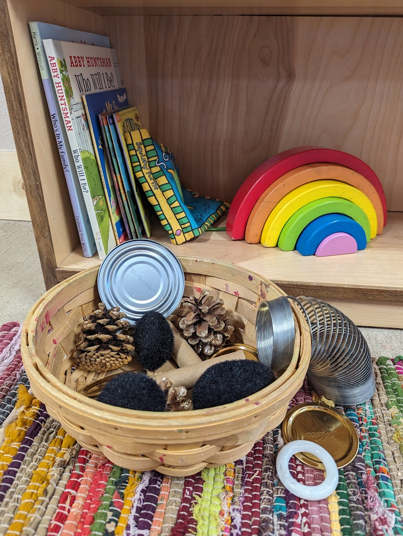 Here’s what you will find in the Loose Parts Play Hub this month: – Treasure Basket: New on the book shelf is a treasure basket. Treasure baskets are collections of beautiful or interesting items for infants and toddlers to explore. Children learn so much through their senses and these baskets offer a variety of different