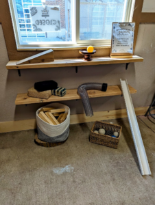 A new station has been identified in the Loose Parts Play Hub! Along with the materials station and the mark making station we now have a building station! These shelves will always contain items for building and engineering. For the month of April we will continue with our ball maze materials.
