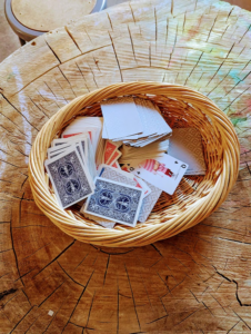 One (or four) deck of cards, so many ways to use! Cards are a great loose part and conversation piece, and can also provide hours of family game time. Younger children will like to collect, sort and talk about differences and similarities in each of the cards. Preschool or elementary ages would like Slap Jack, solitaire, or speed.
